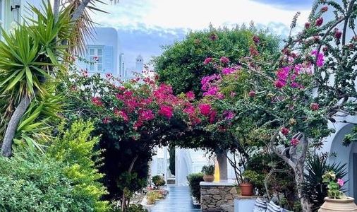 The cute bougainvillea arch of Semeli Hotel Mykonos